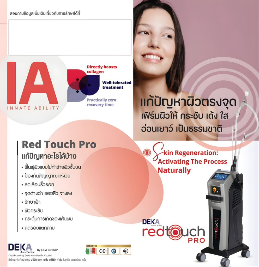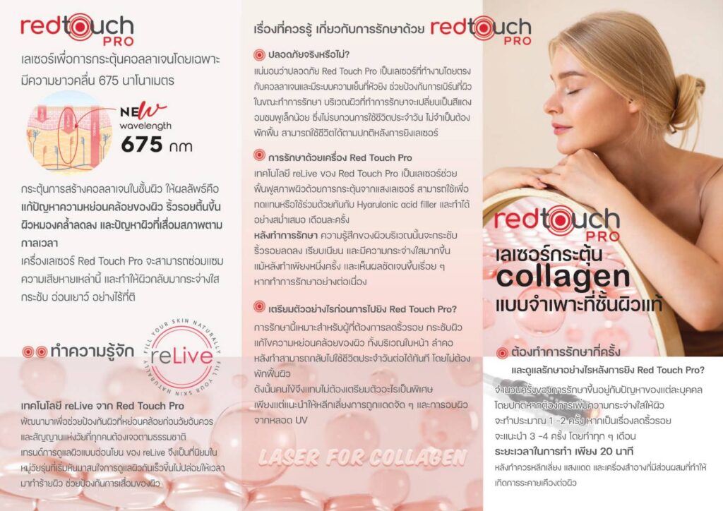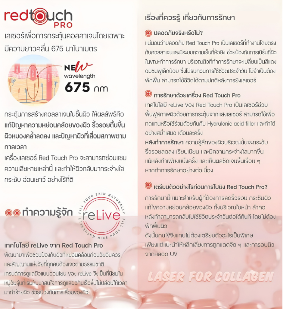 Red Touch Pro Laser เป็นเทคโนโลยีเลเซอร์ความยาวคลื่น 675 nm ที่ออกแบบมาเพื่อฟื้นฟูผิวโดยเฉพาะ ช่วยกระตุ้นการสร้างคอลลาเจนอย่างมีประสิทธิภาพ ไม่ทำลายผิวชั้นบน เหมาะสำหรับการปรับสภาพผิวให้กลับมาเรียบเนียน อีกทั้งยังช่วยในเรื่องลดเลือนริ้วรอย แก้ปัญหาการหย่อนคล้อยและเพิ่มความยืดหยุ่นของผิว โดยมีความอ่อนโยนสูง เจ็บน้อย และใช้เวลาพักฟื้นสั้น